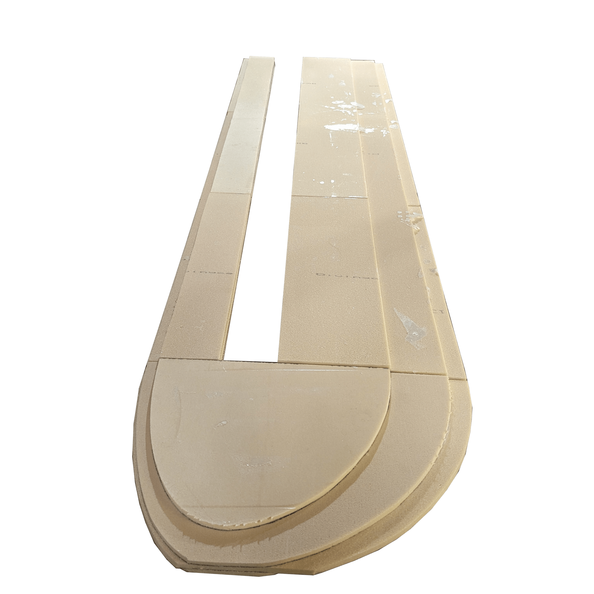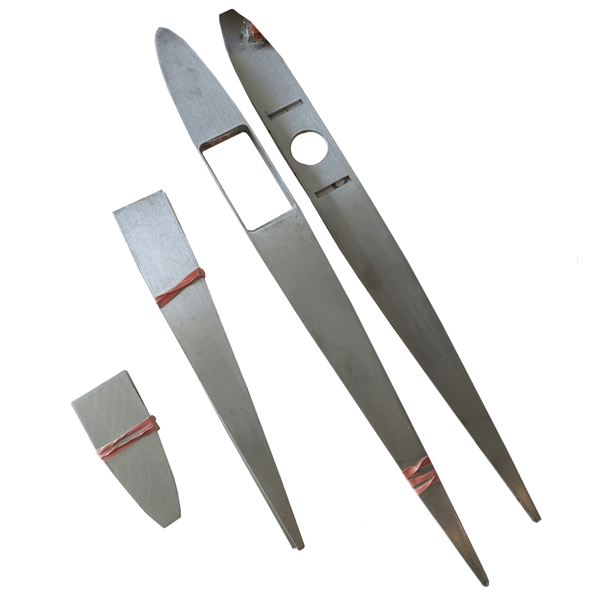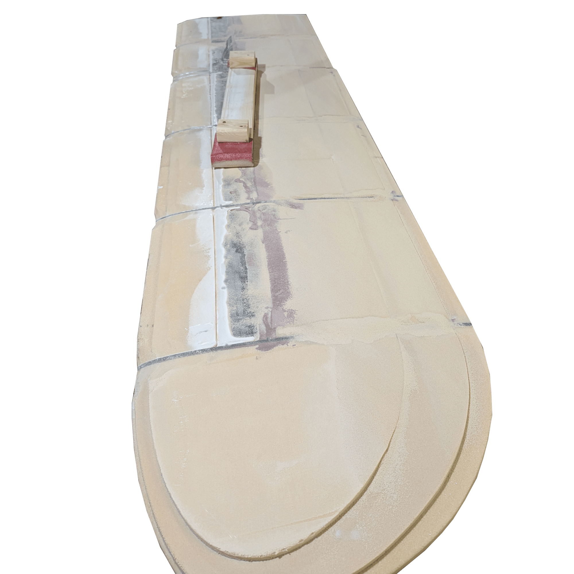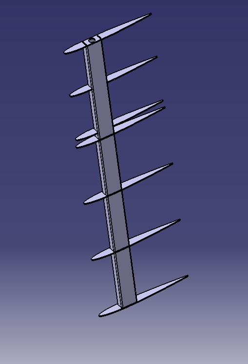 A NACA 0012 profile was selected for the foil. The top 24″ of the board that never exits the trunk under the boat is flat on each side of the beam and square at the leading and trailing edge. These flat surfaces exist to make it easier to mount plastic sliders to the daggerboard. Only the sliders contact the trunk. The bottom 12″ tip is shaped by hand between the lowest rib and the end.