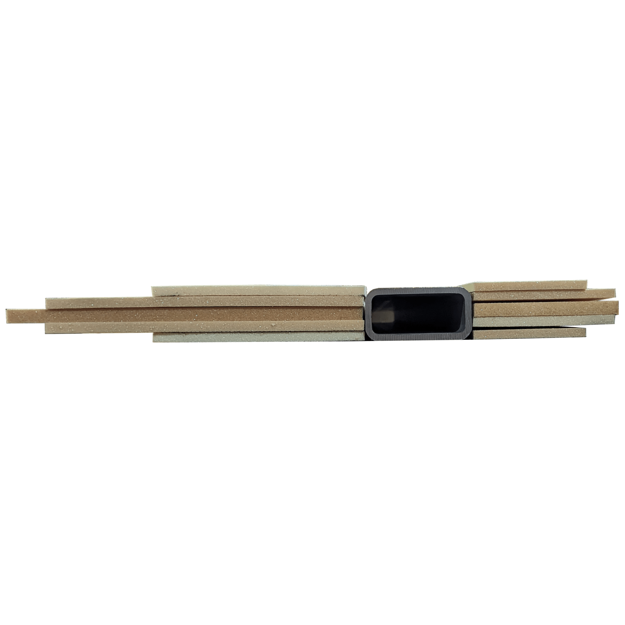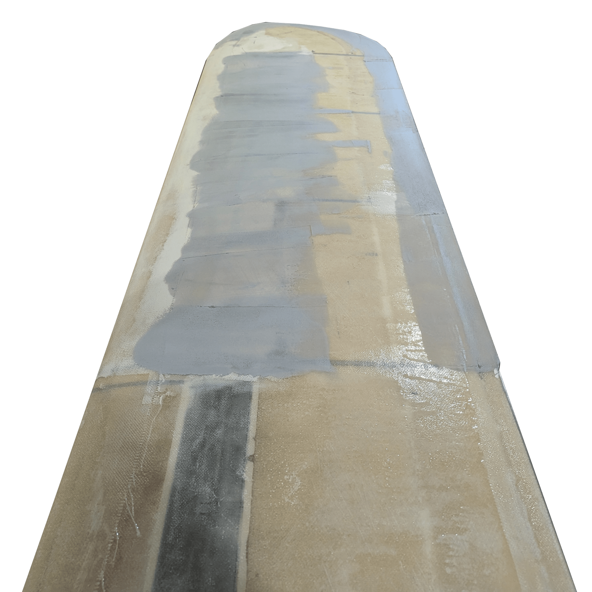 It is easy to design a very strong daggerboard when no compromise is required to achieve a low weight, it actually becomes hard to make it heavy enough. The original daggerboard consisted of two molded fiberglass halves, bonded together with an aluminum beam in the center. The sinking weight was achieved with the addition of lead shots poured in the empty daggerboard shell before it was closed. I opted for a stainless structure consisting of a 2″x4″ 1/4″ wall tube and 1/4″ thick ribs. The tube supports the bending loads while the ribs control the twisting and control the shape of the board. It is also just heavy enough, when combined with the rest of the materials, to sink to the desired depth. The stainless parts are welded together. The space between the ribs is filled with closed cell foam core and sanded to shape. The stainless ribs helped control the shape while sanding down the foam. The last foot of the daggerboard is only foam and fiberglass and is sacrificial.