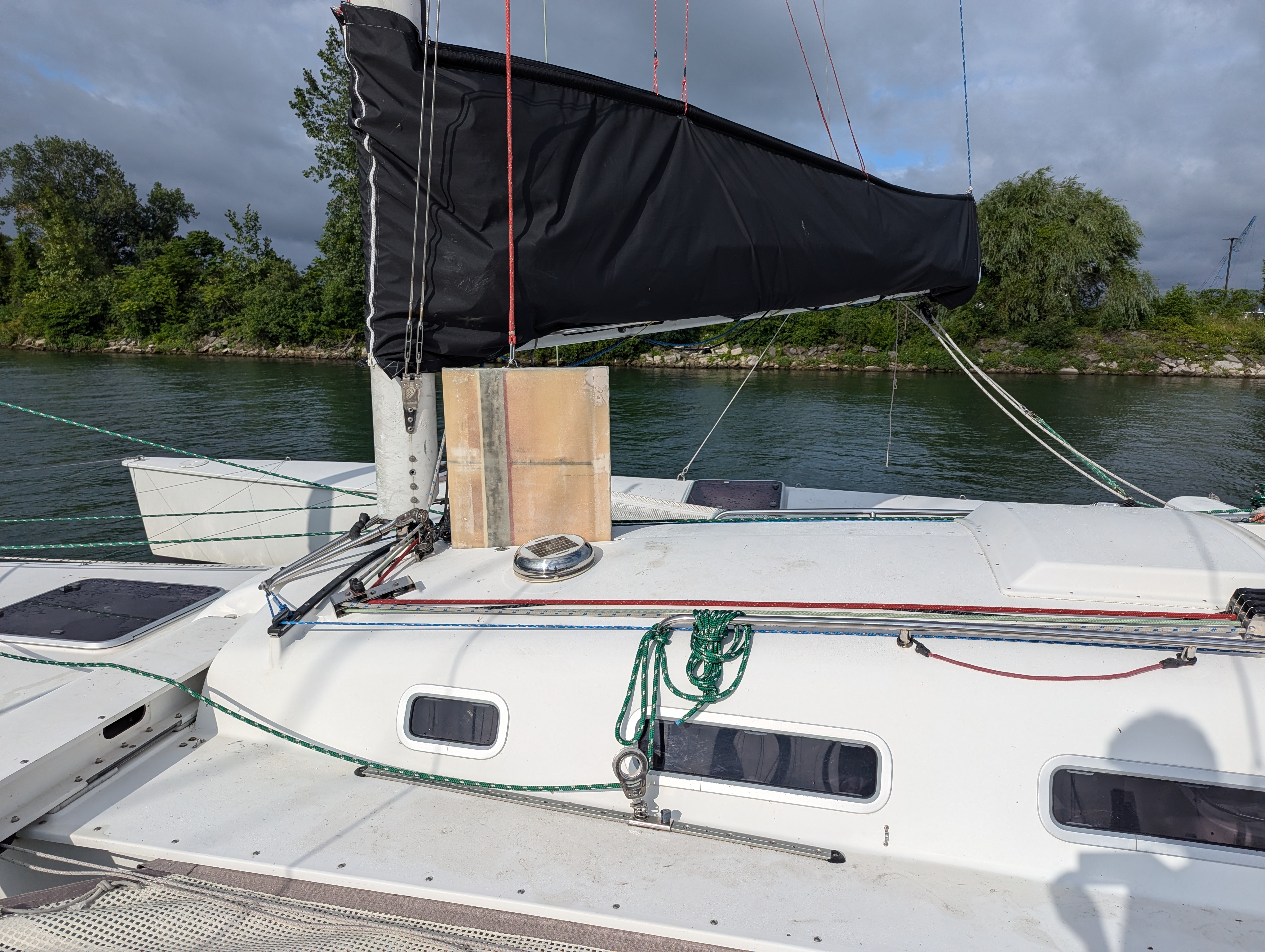 In most performance oriented multihulls, an effort is made to lower the total weight. Consequently, daggerboards and all other components need to be carefully designed to strike a balance between cost, weight and strength. However, the original Contour 34SC daggerboard sinks, meaning it is at least as heavy as its volume in water. It is necessary because it relies on gravity to go down in the trunk. There is no provision or space for a “daggerboard down” control line on the boat. The “sinking” feature of the daggerboard was retained for the new design.